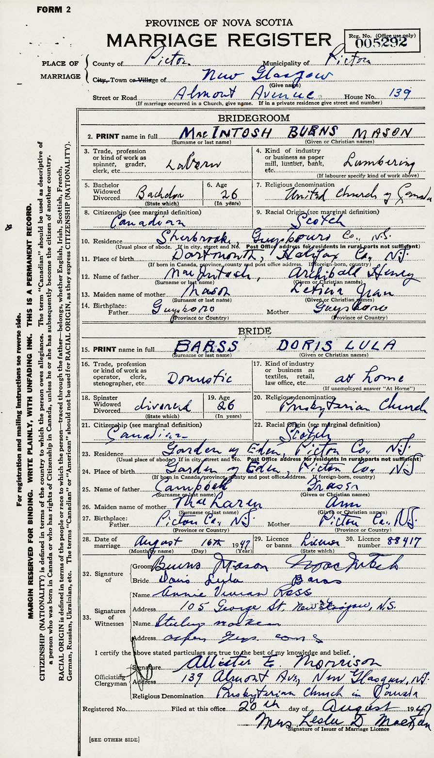 28. Date of marriage August 16 1947 29. By license or banns License 30. License number 88417