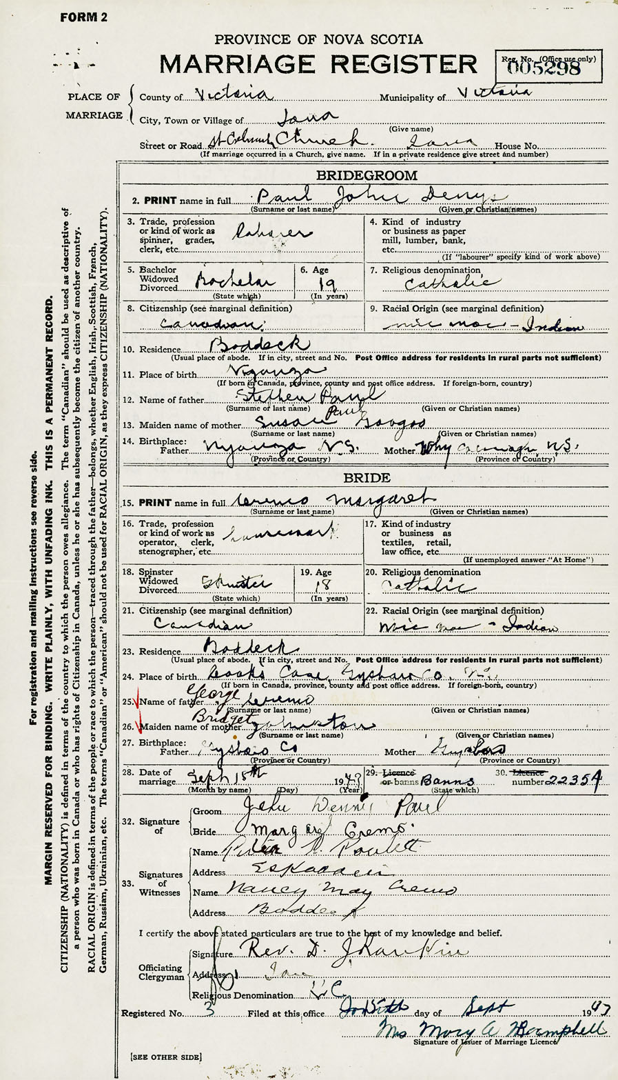 21. Citizenship Canadian 22. Racial origin Mic Mac Indian