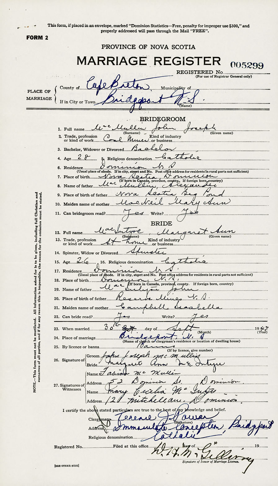 PLACE OF MARRIAGE County of Cape Breton in City or Town Bridgeport