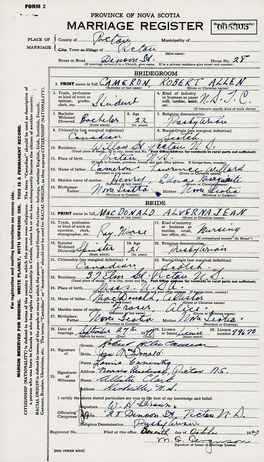 28. Date of marriage September 27 1947 29. By license or banns License 30. License number 89670