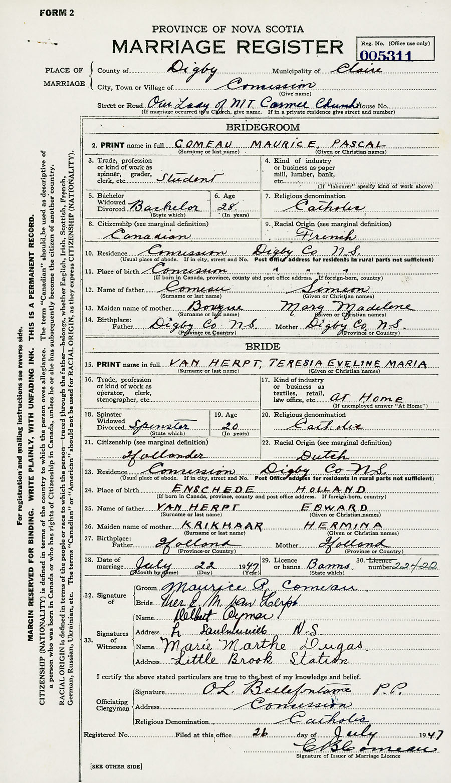 28. Date of marriage July 22 1947 29. By license or banns License 30. License number
