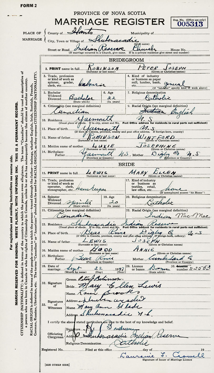 28. Date of marriage September 22 1947 29. By license or banns License 30. License number