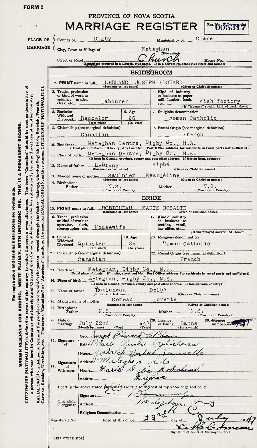 24. Place of birth Meteghan, Digby County, Nova Scotia