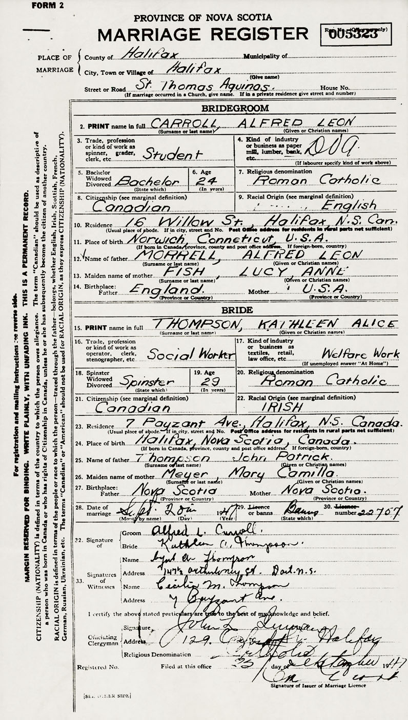 28. Date of marriage September 20 1947 29. By license or banns License 30. License number