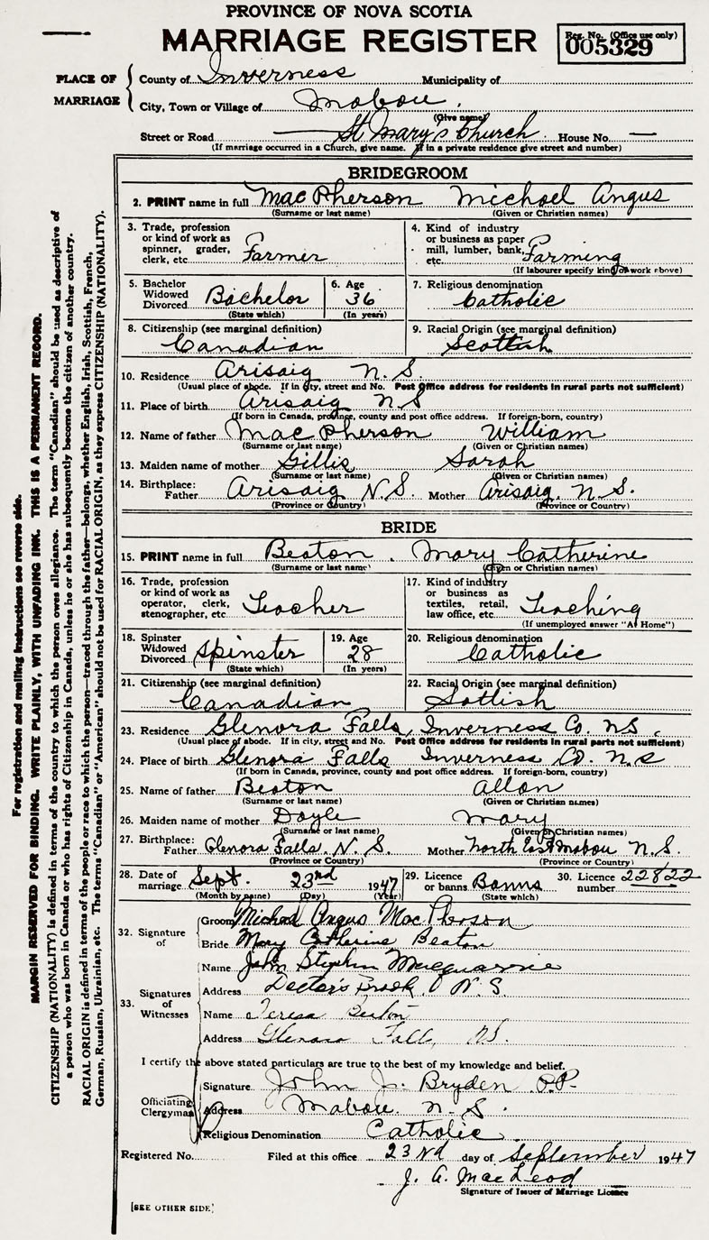 14. Birthplace Father Arisaig, Nova Scotia Mother Arisaig, Nova Scotia