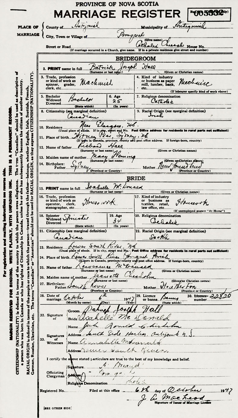 11. Place of birth Witrey Pier, Syndey, Nova Scotia