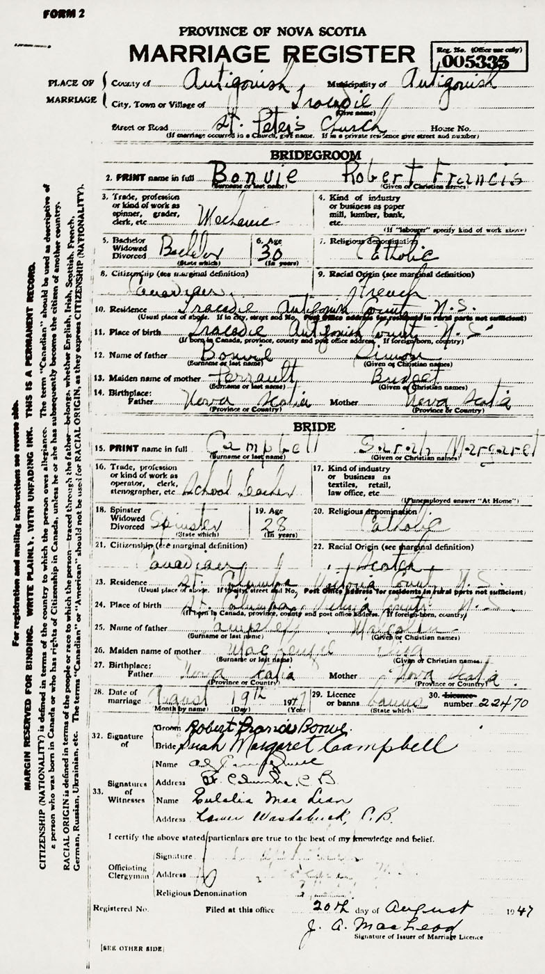 PLACE OF MARRIAGE County of Antigonish