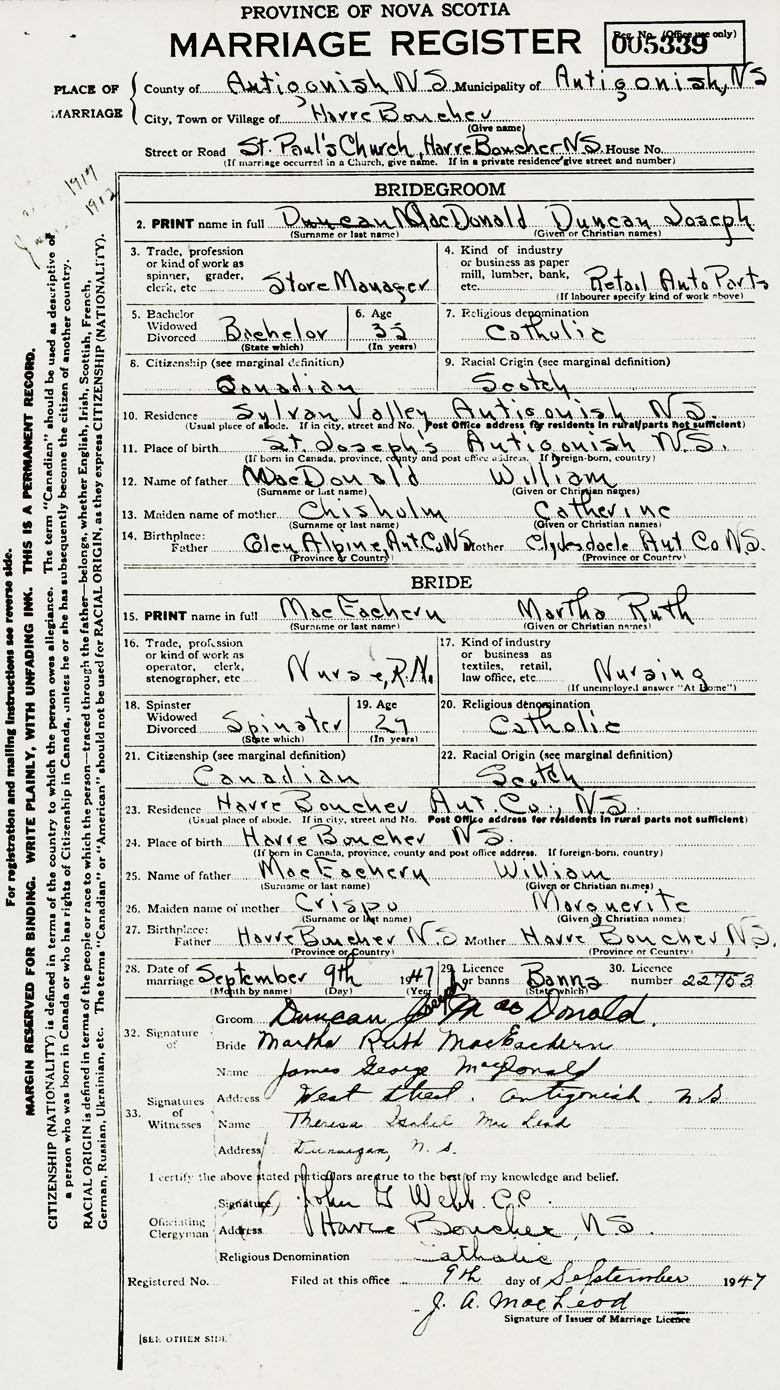 28. Date of marriage September 9 1947 29. By license or banns License 30. License number 22703