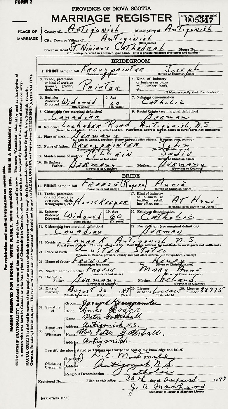 28. Date of marriage August 30 1947 29. By license or banns License 30. License number 88975