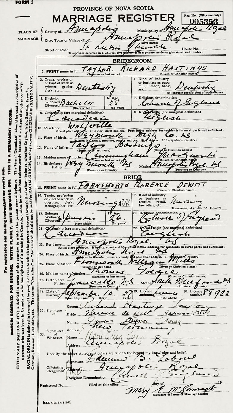 14. Birthplace Father Weymouth, Nova Scotia Mother Annapolis Royal, Nova Scotia
