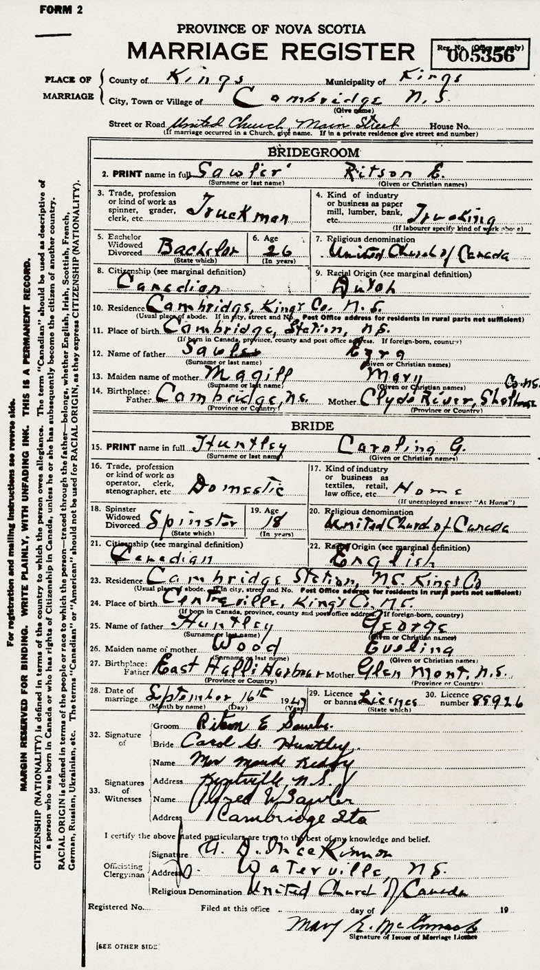 14. Birthplace Father Cambridge, Nova Scotia Mother Clyde River, Shelburne County, Nova Scotia