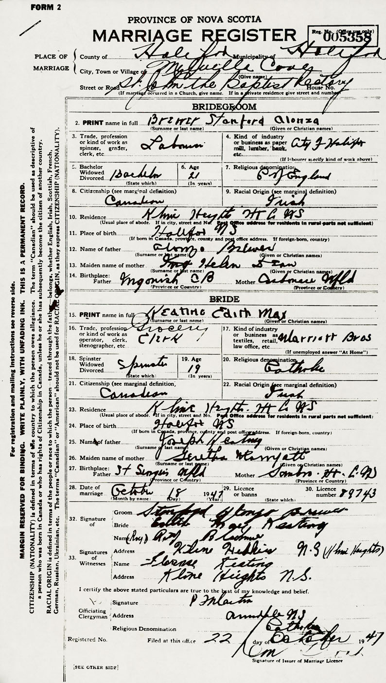 28. Date of marriage October 18 1947 29. By license or banns License 30. License number 89743