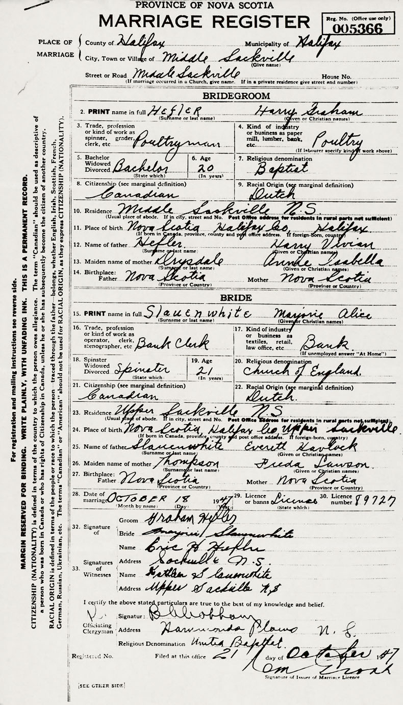 28. Date of marriage October 18 1947 29. By license or banns License 30. License number 89727