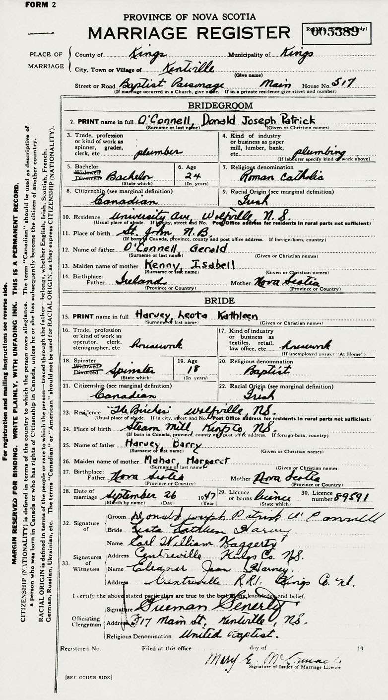 28. Date of marriage September 26 1947 29. By license or banns License 30. License number 89591