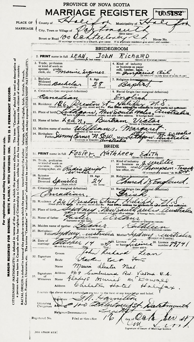 28. Date of marriage October 14 1947 29. By license or banns License 30. License number 89741