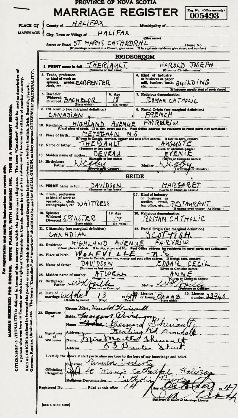 28. Date of marriage October 13 1947 29. By license or banns License 30. License number 22940