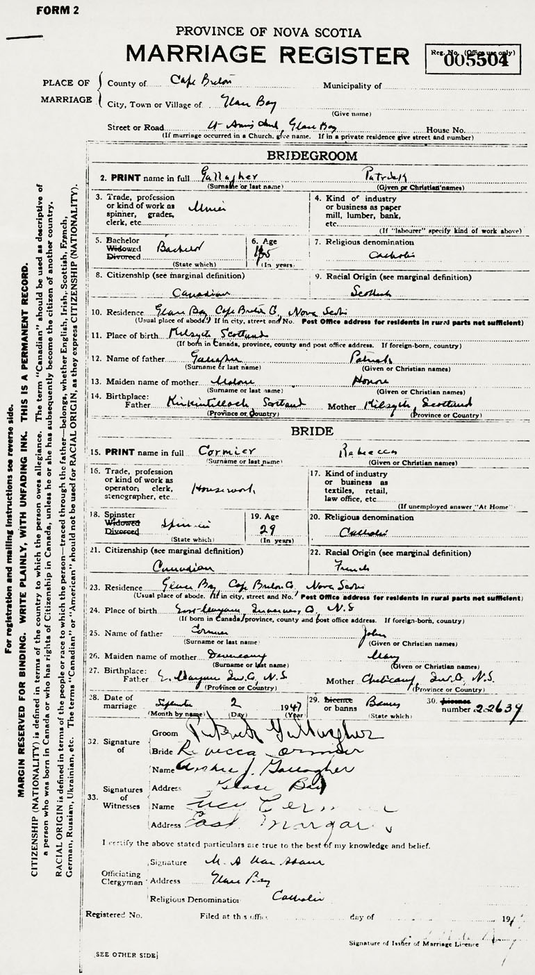PLACE OF MARRIAGE County of Cape Breton