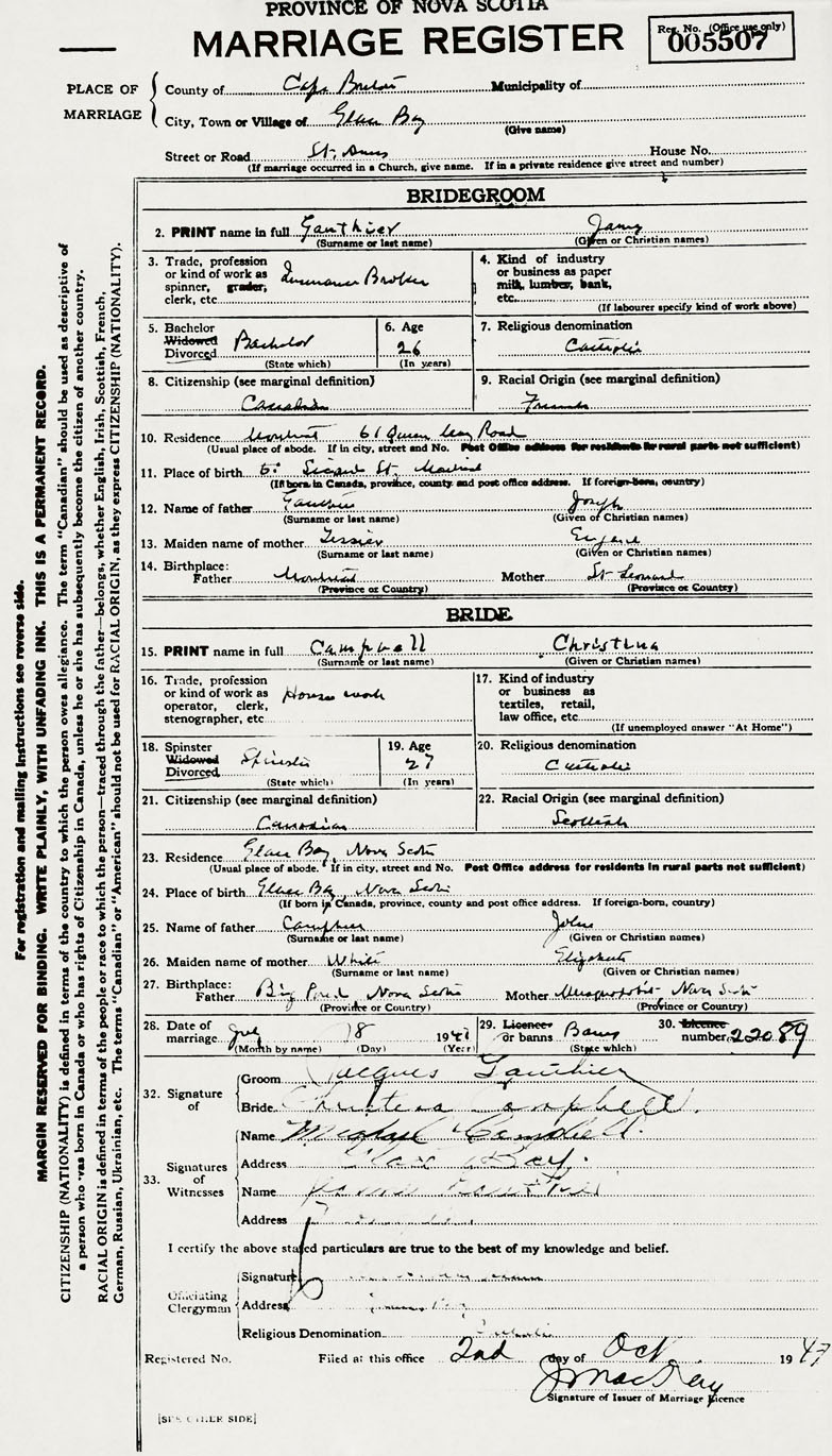 PLACE OF MARRIAGE County of Cape Breton