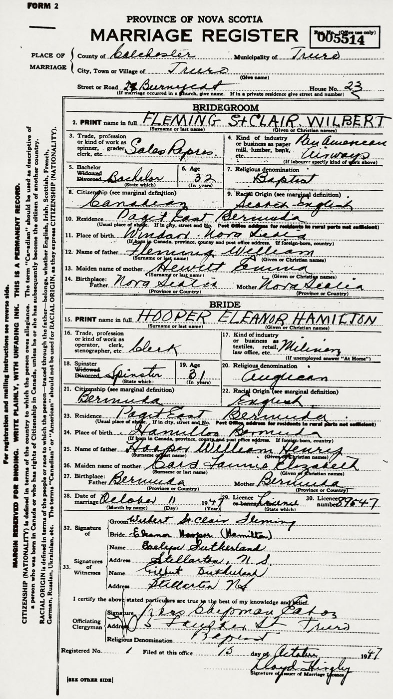 28. Date of marriage October 11 1947 29. By license or banns License 30. License number 89547
