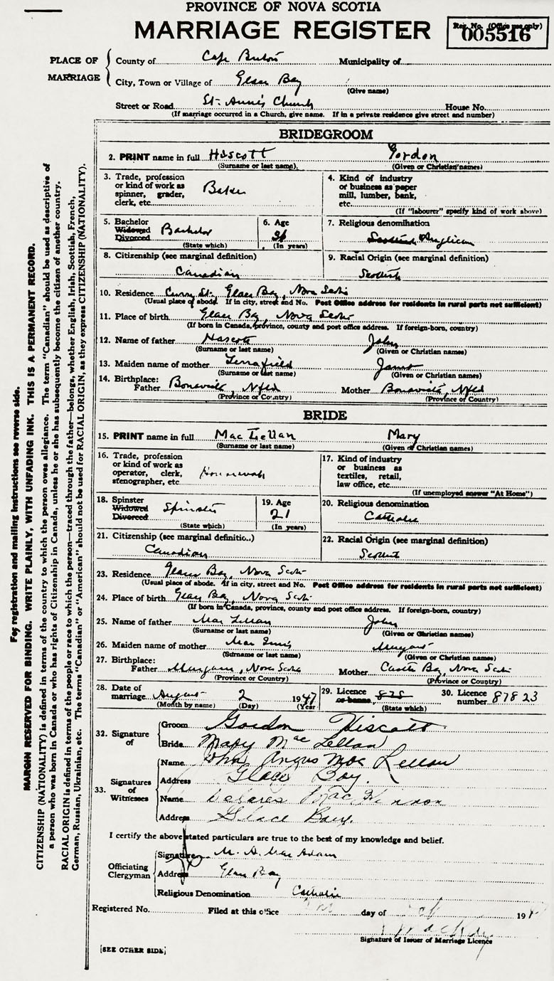 27. Birthplace Father Margaree, Nova Scotia Mother Castle Bay, Nova Scotia