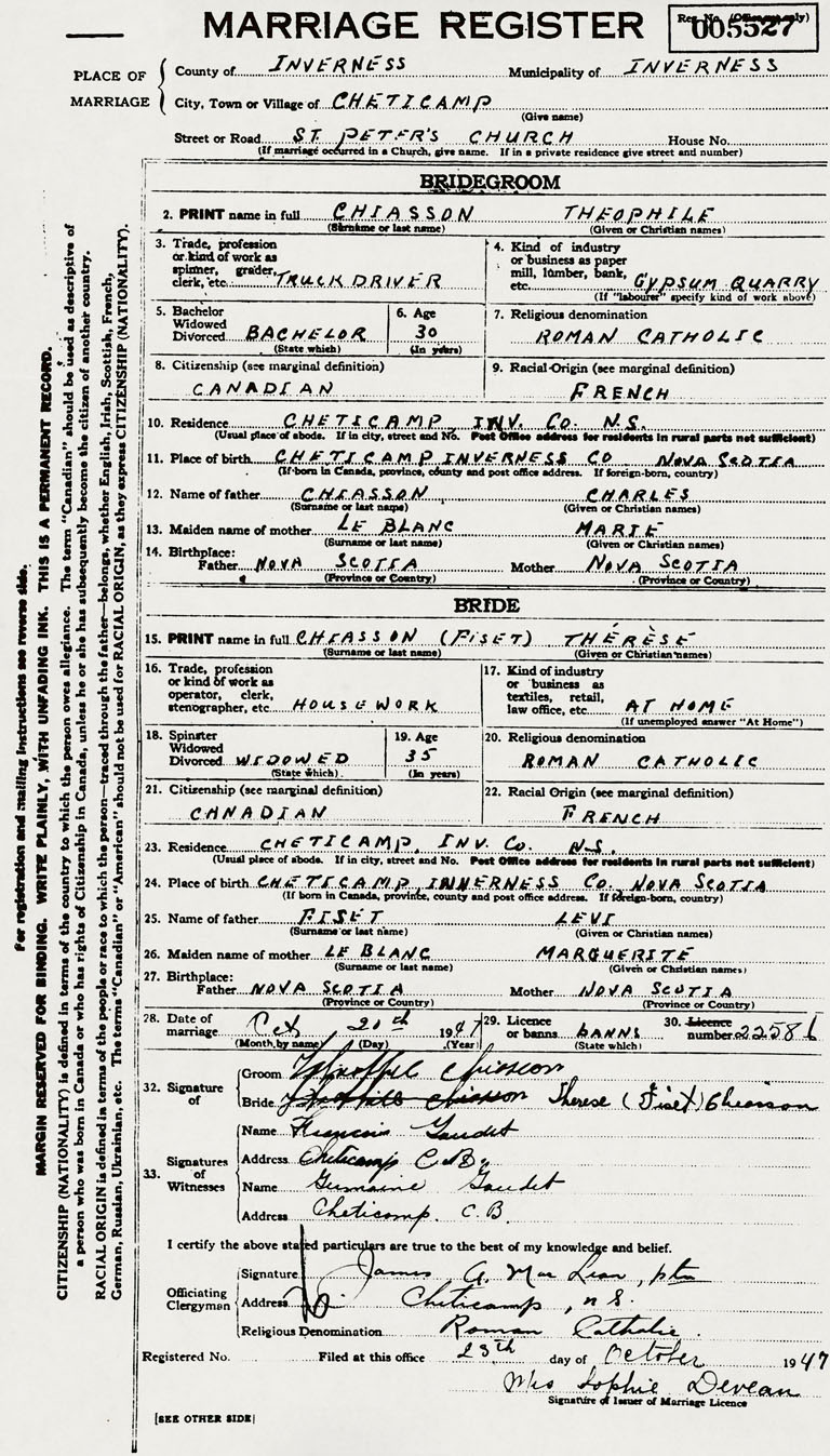 11. Place of birth Cheticamp, Inverness County, Nova Scotia