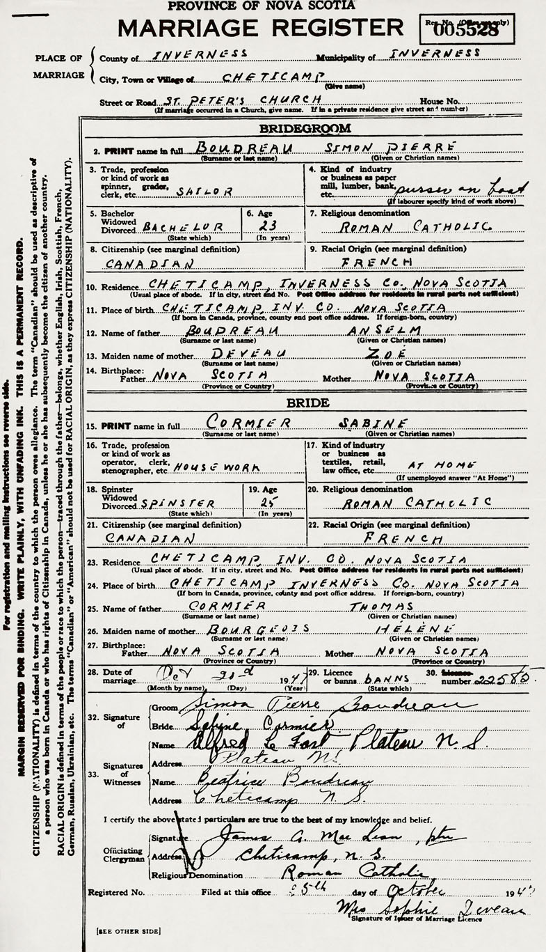24. Place of birth Cheticamp, Inverness County, Nova Scotia