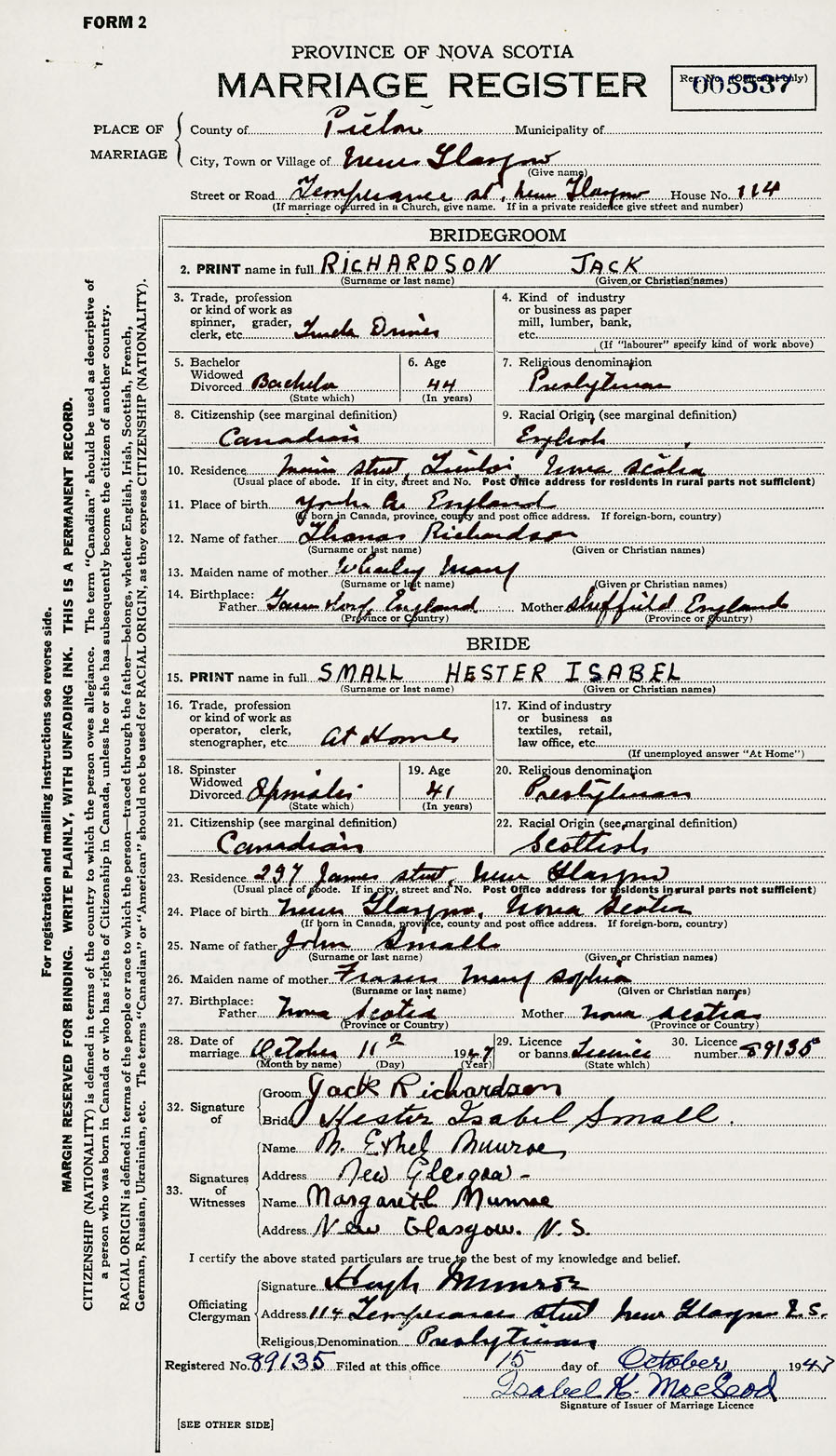 28. Date of marriage October 11 1947 29. By license or banns License 30. License number 89135
