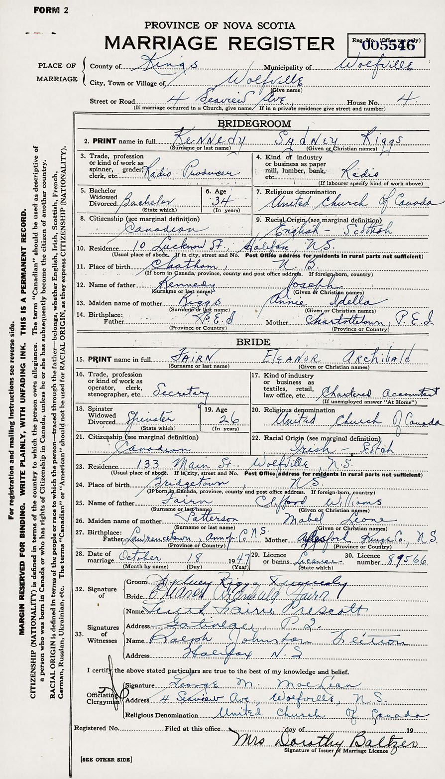 28. Date of marriage October 18 1947 29. By license or banns License 30. License number 89566