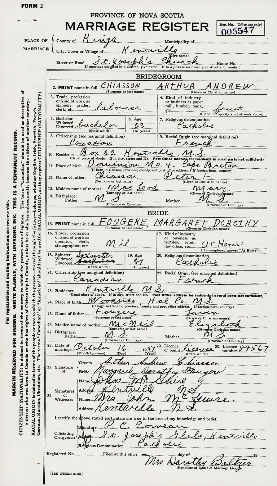 28. Date of marriage October 16 1947 29. By license or banns License 30. License number 89567