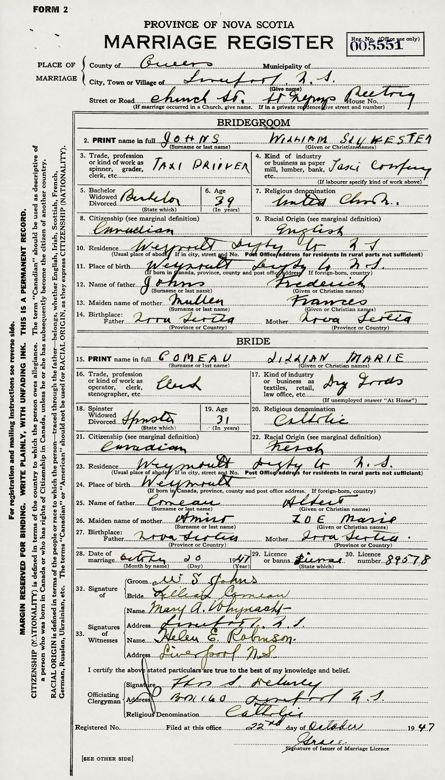 28. Date of marriage October 20 1947 29. By license or banns License 30. License number 89578