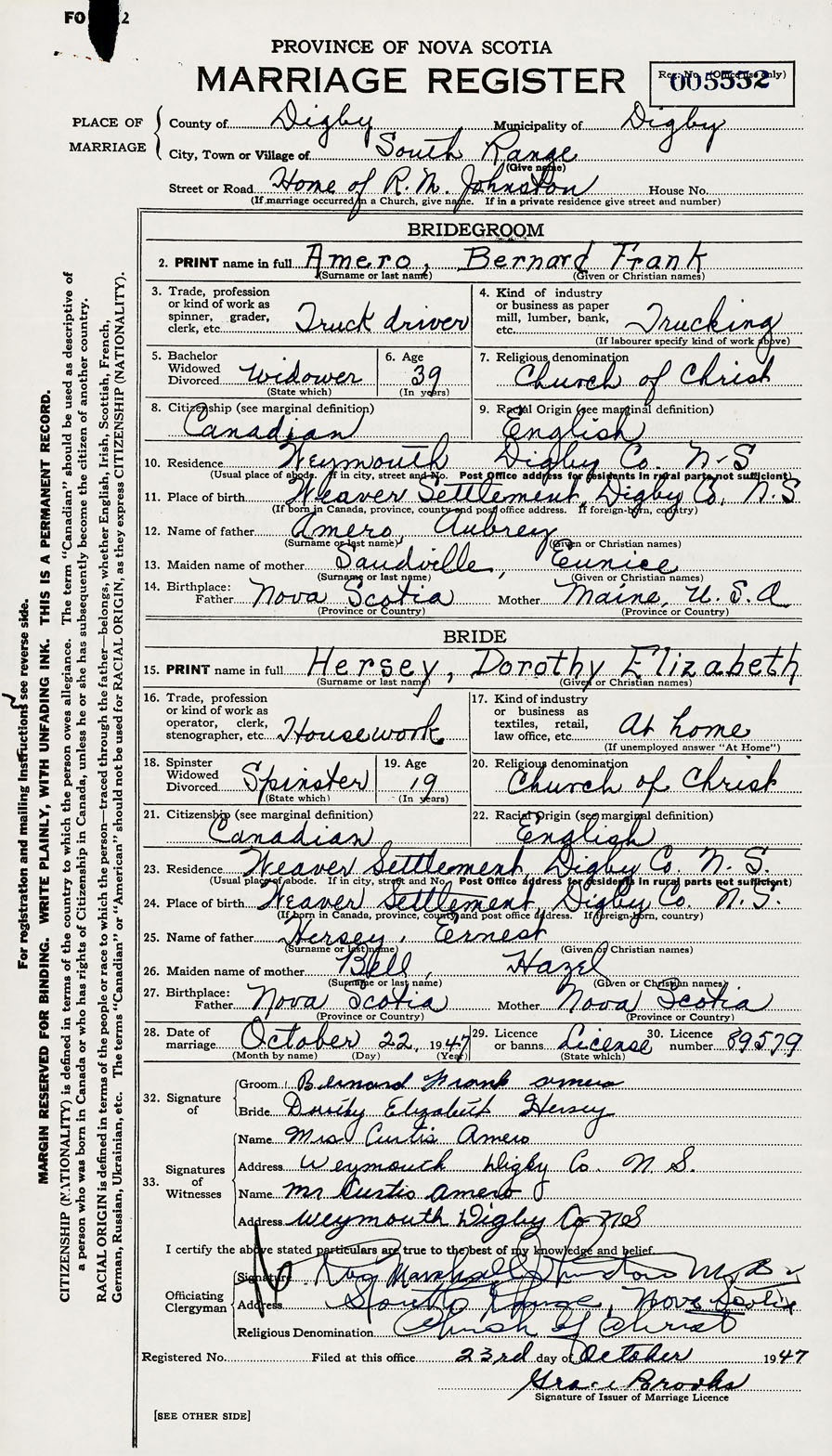 28. Date of marriage October 22 1947 29. By license or banns License 30. License number 89579