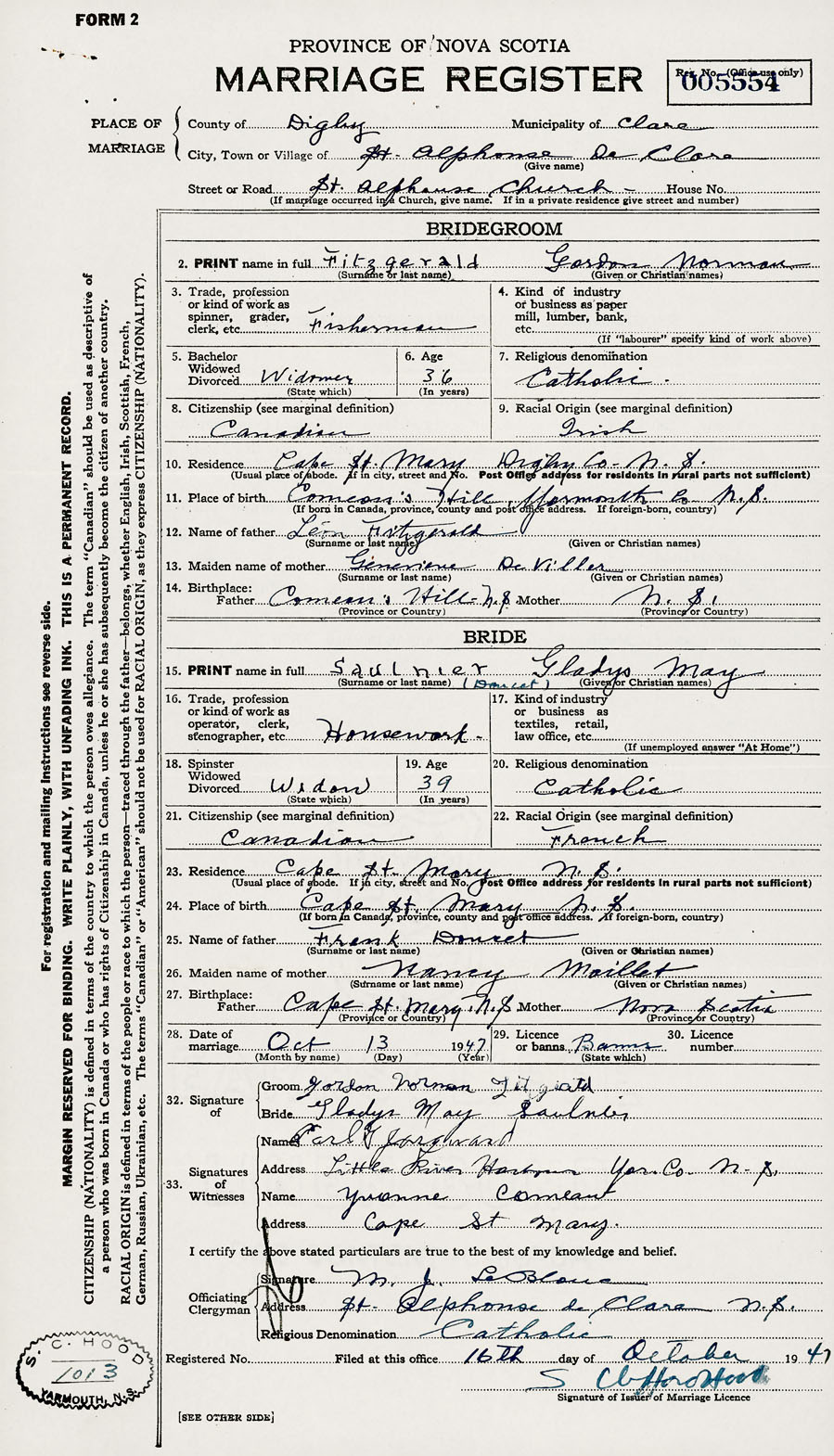 11. Place of birth Comeau’s Hill, Yarmouth County, Nova Scotia