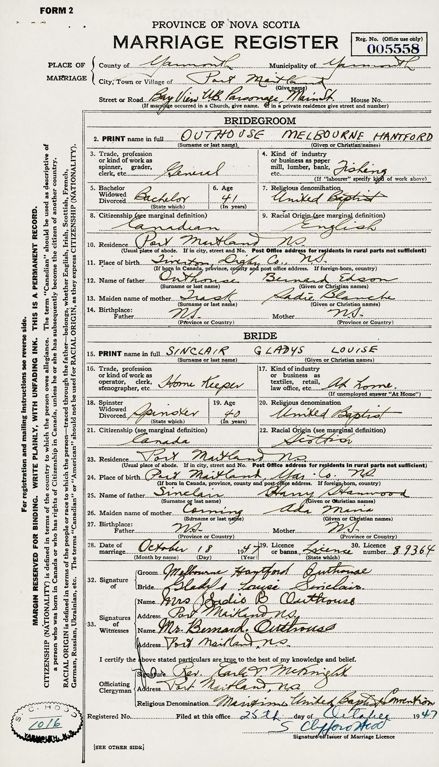24. Place of birth Port Maitland, Yar. County, Nova Scotia