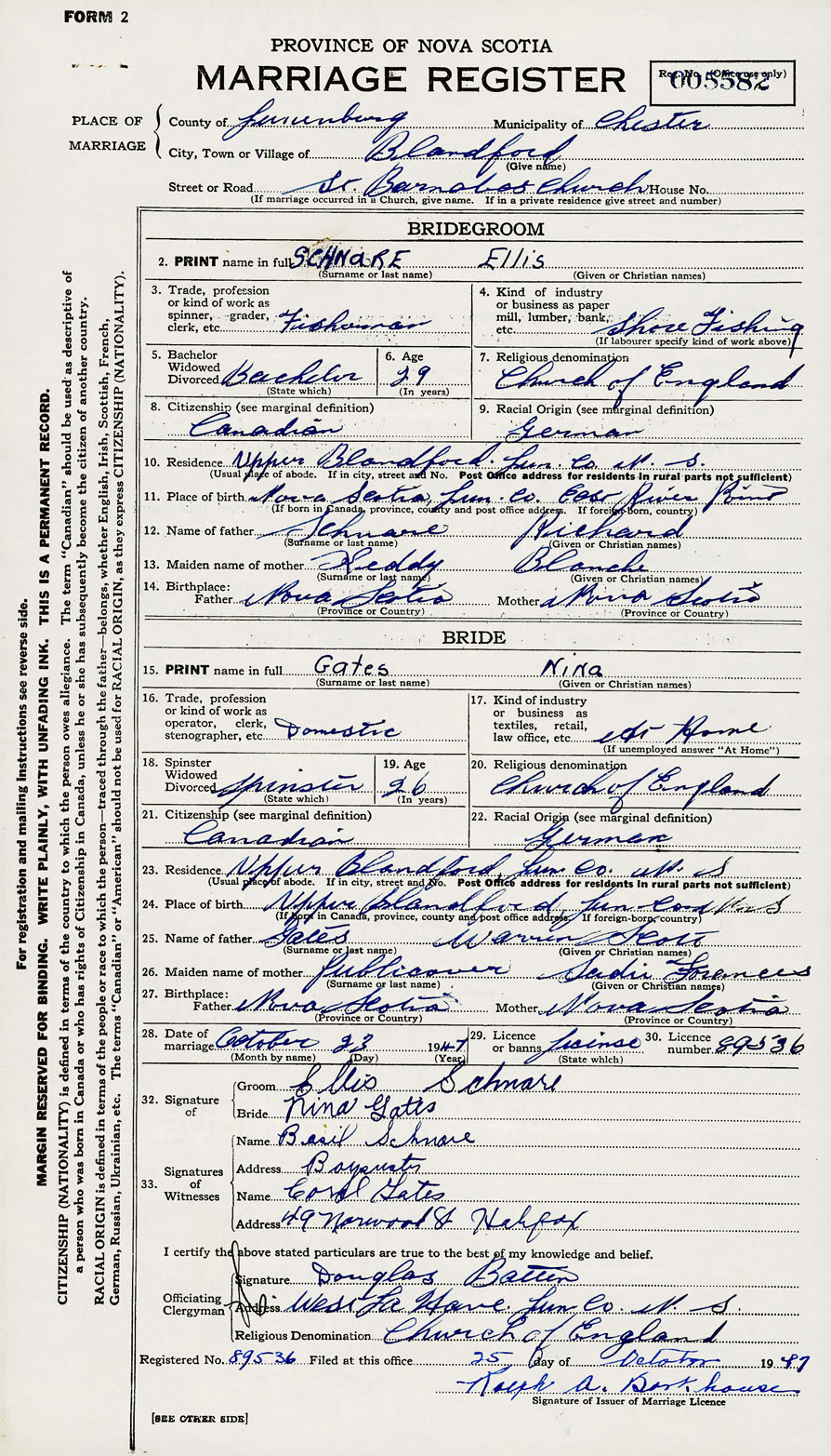 28. Date of marriage October 23 1947 29. By license or banns License 30. License number 89536