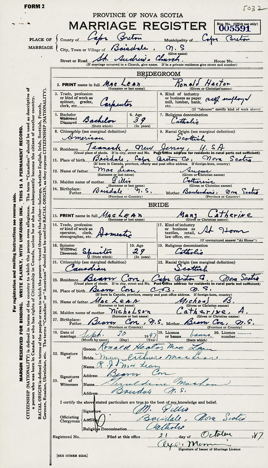 14. Birthplace Father Boisdale, Nova Scotia Mother Boularderie, Nova Scotia