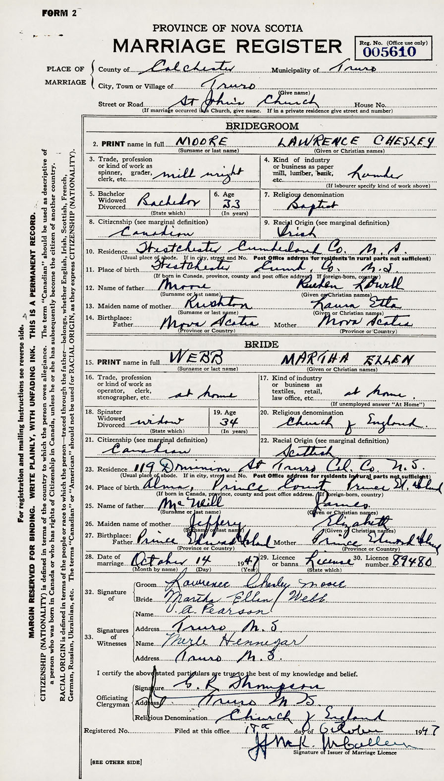 28. Date of marriage October 14 1947 29. By license or banns License 30. License number 89480