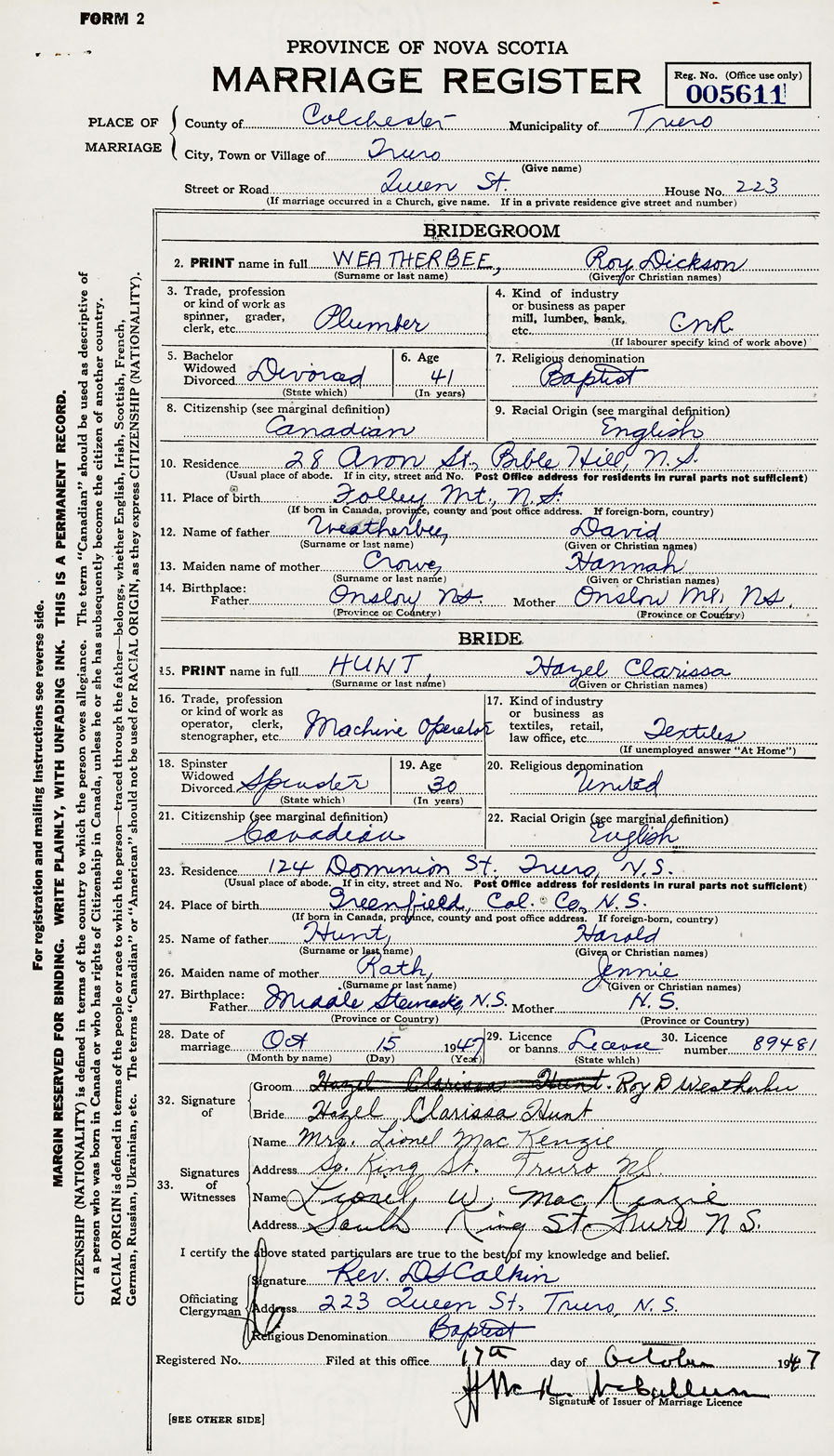 28. Date of marriage October 15 1947 29. By license or banns License 30. License number 89481