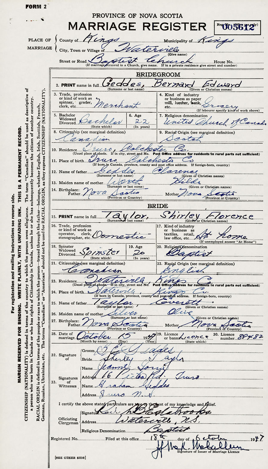 28. Date of marriage October 15 1947 29. By license or banns License 30. License number 89482