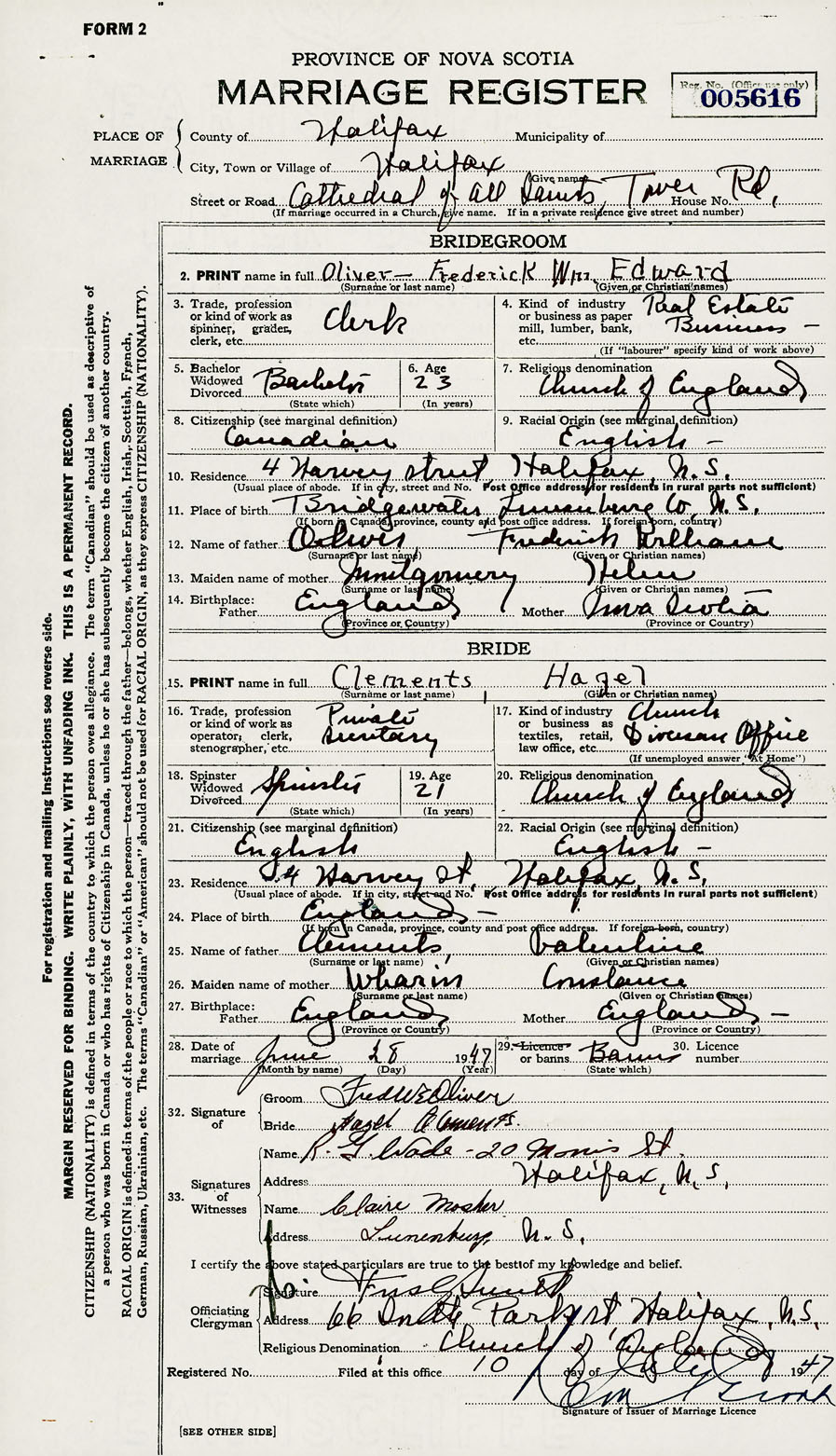 Groom Frederick Will Edward Oliver