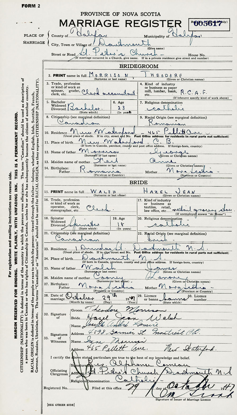 28. Date of marriage October 29 1947 29. By license or banns License 30. License number