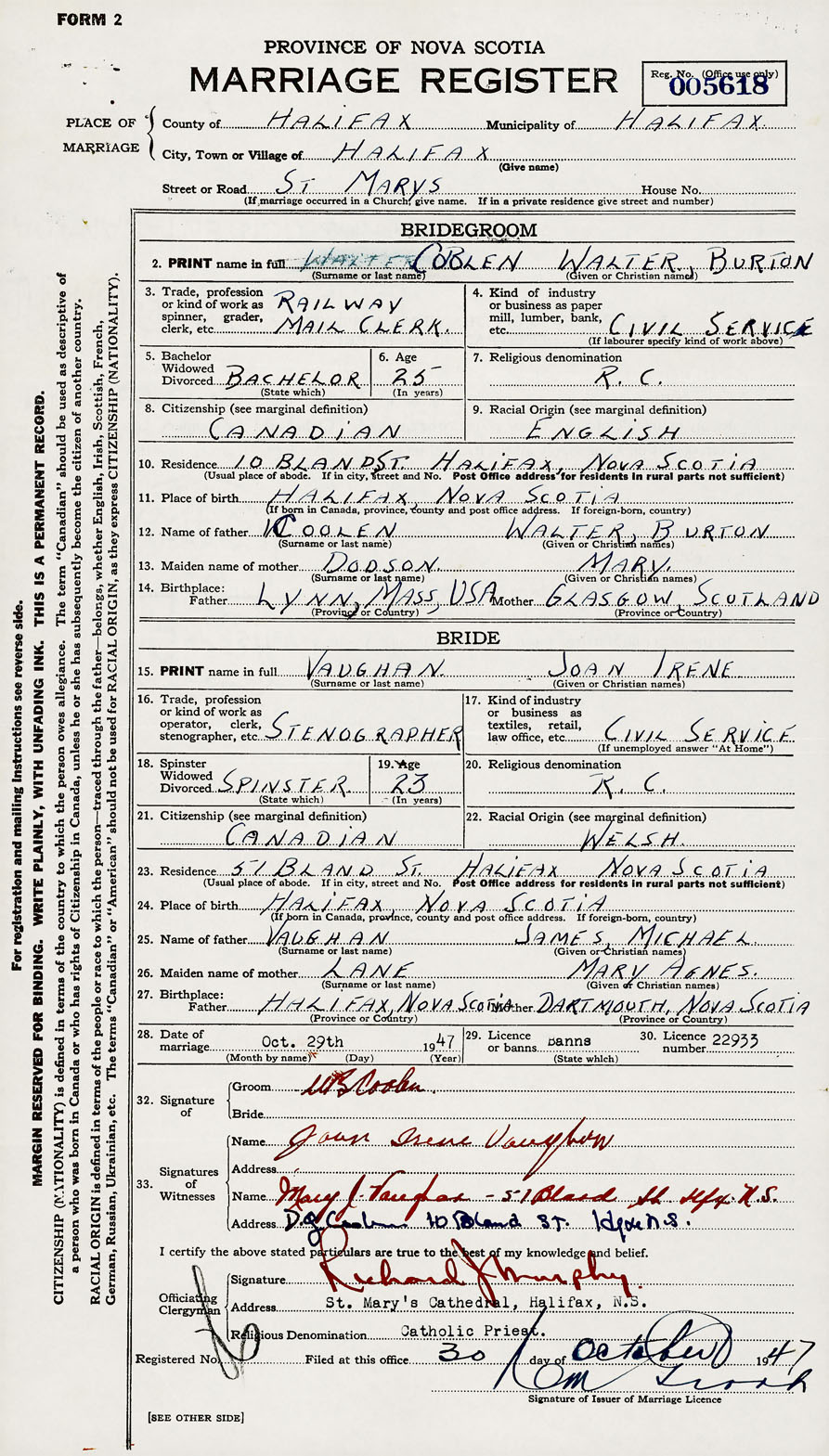 28. Date of marriage October 29 1947 29. By license or banns License 30. License number