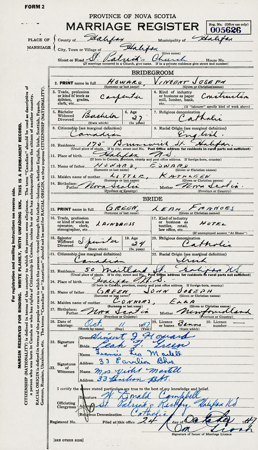 28. Date of marriage October 11 1947 29. By license or banns License 30. License number