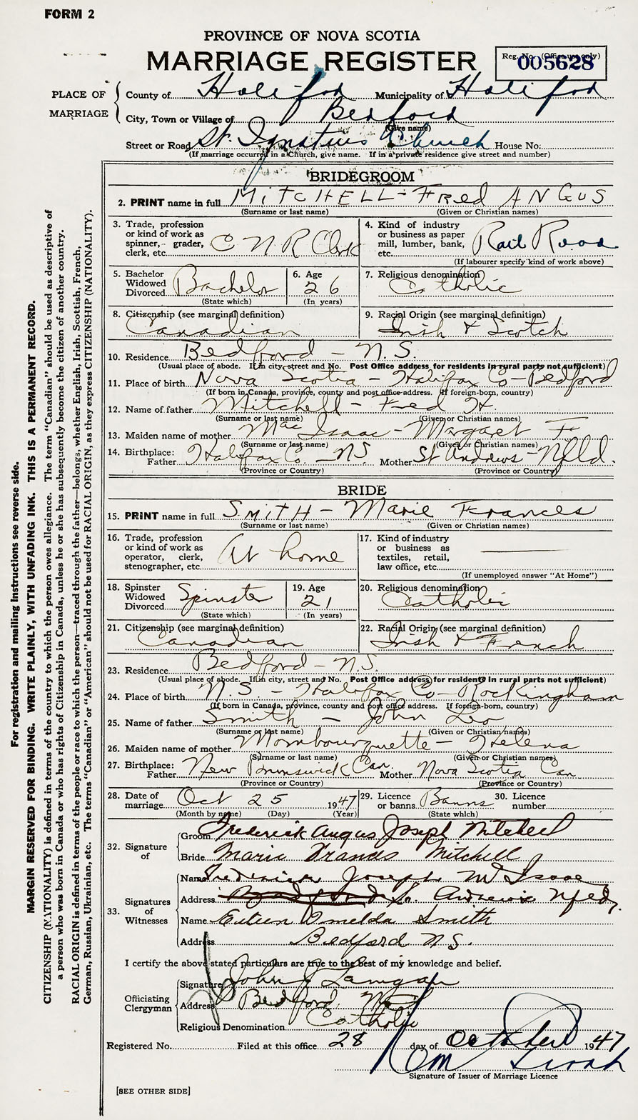 28. Date of marriage October 25 1947 29. By license or banns License 30. License number