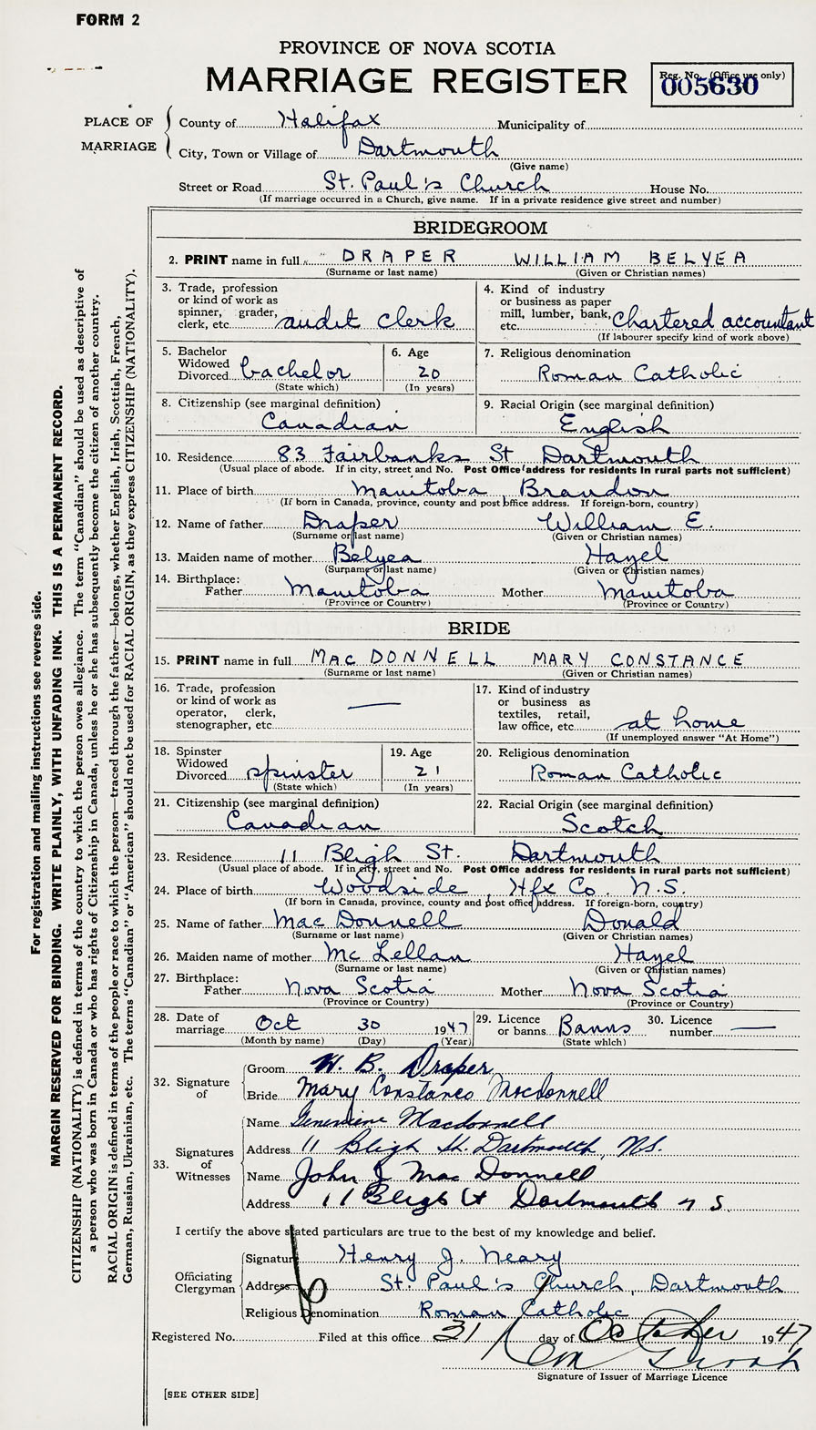 28. Date of marriage October 30 1947 29. By license or banns License 30. License number