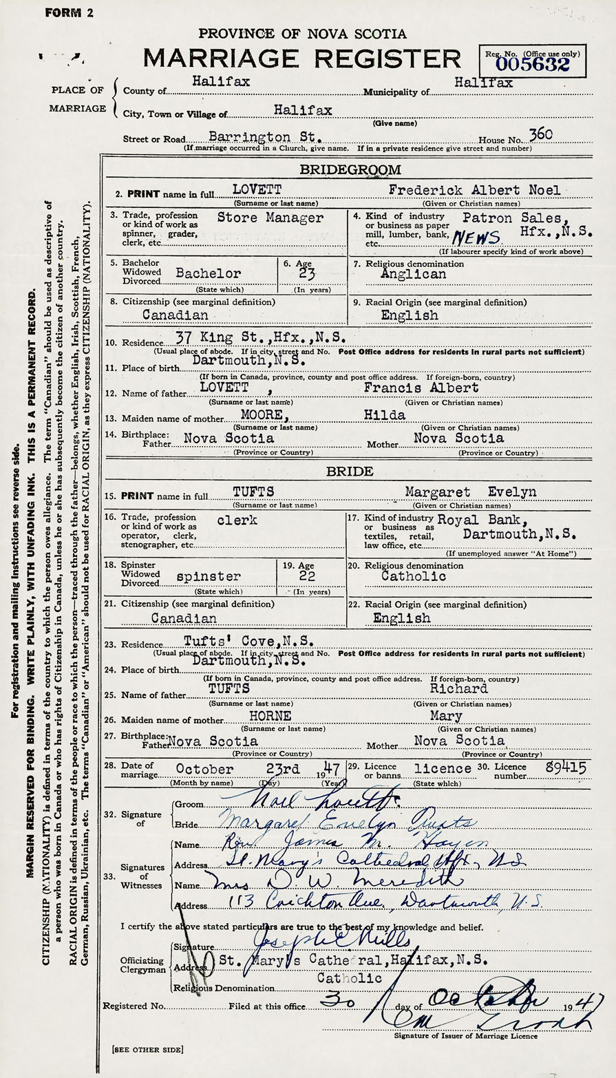 28. Date of marriage October 23 1947 29. By license or banns License 30. License number 89415