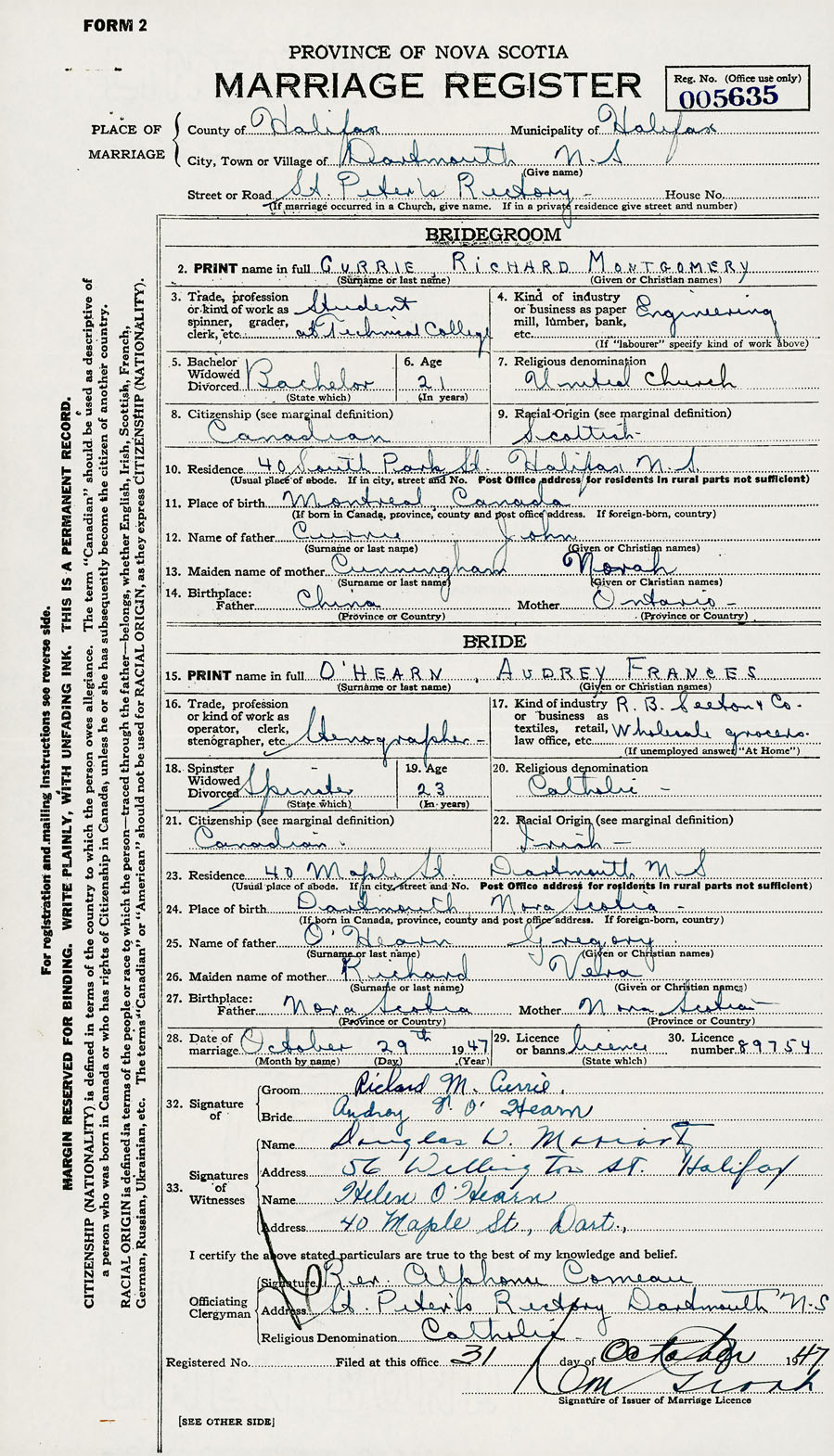 28. Date of marriage October 29 1947 29. By license or banns License 30. License number 89754
