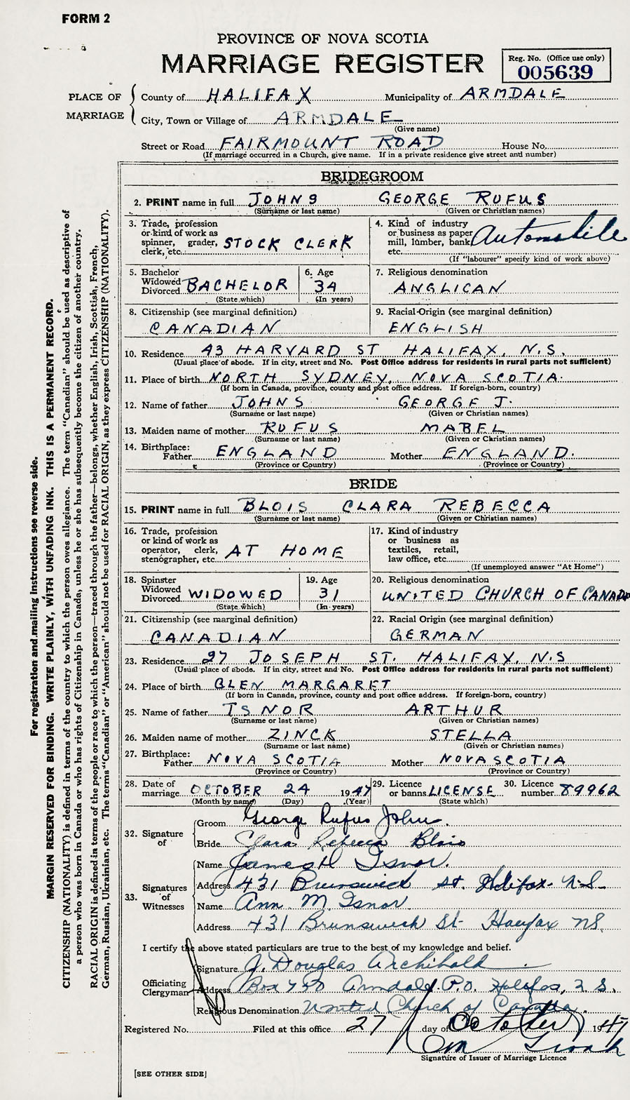 28. Date of marriage October 24 1947 29. By license or banns License 30. License number 89962
