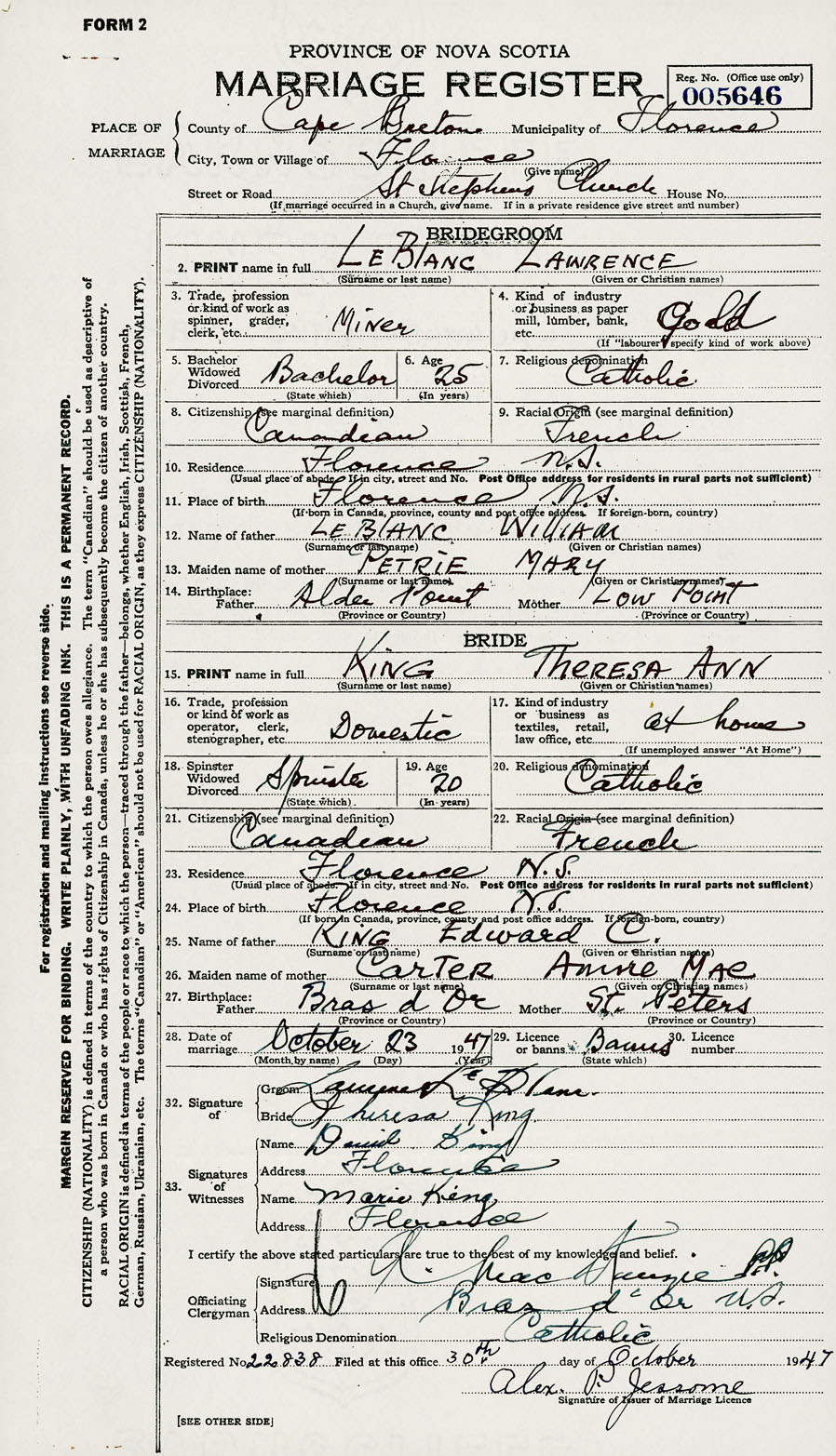28. Date of marriage October 23 1947 29. By license or banns License 30. License number