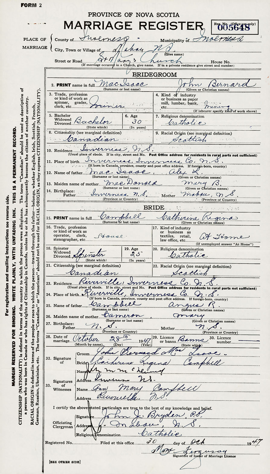 Groom John Bernard MacIsaac