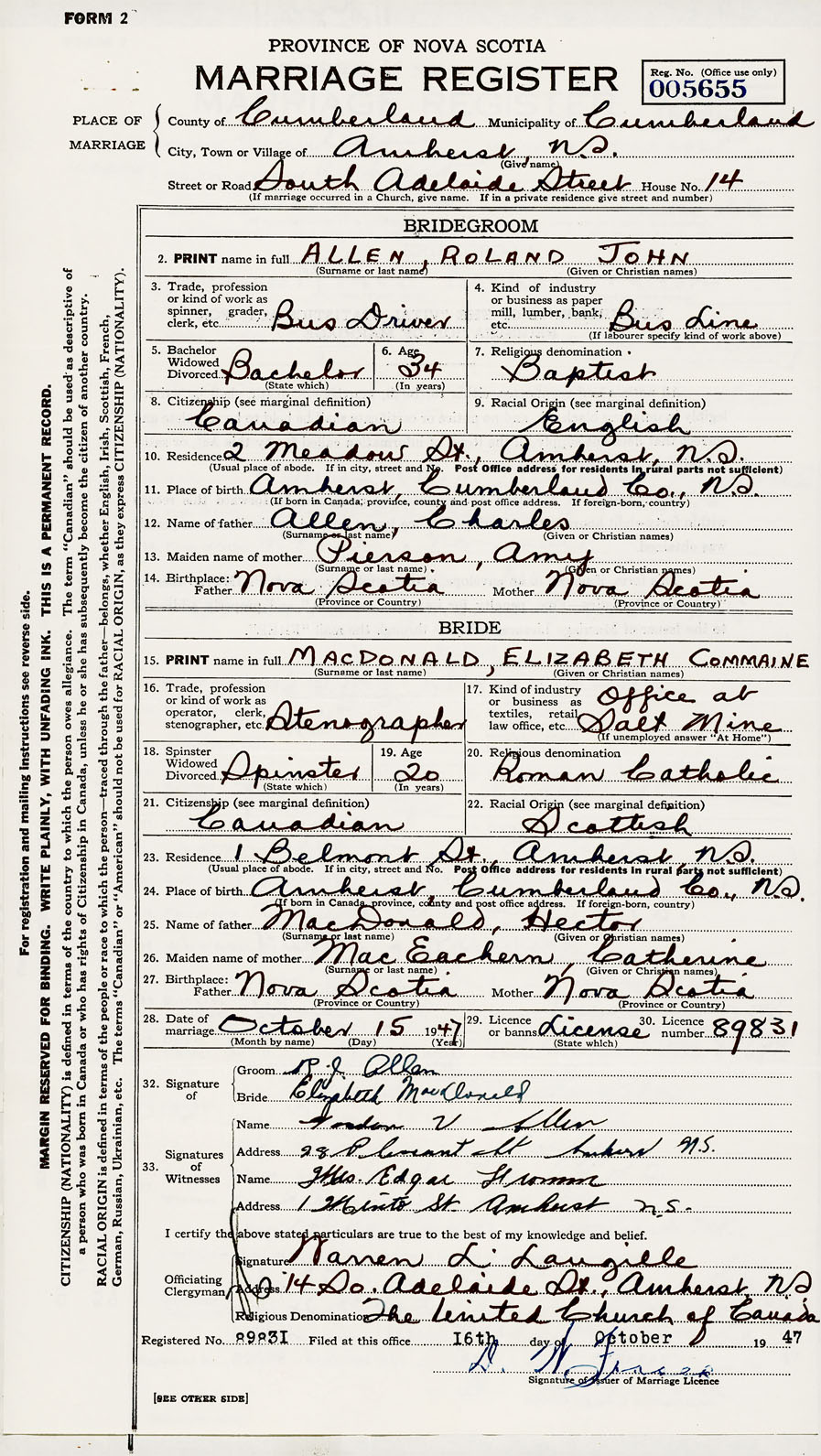 28. Date of marriage October 15 1947 29. By license or banns License 30. License number 89831